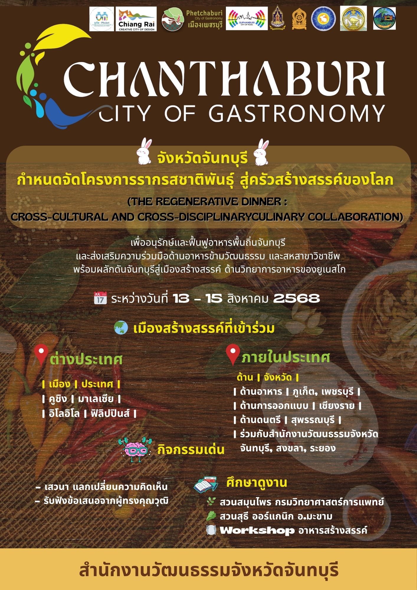 จังหวัดจันทบุรีเตรียมพร้อมเป็นเจ้าภาพจัดงานใหญ่ระดับประเทศ กับโครงการ “รากรสชาติพันธุ์ สู่ครัวสร้างสรรค์ของโลก (The Regenerative Dinner: Cross-Cultural and Cross-Disciplinary Culinary Collaboration)” งานที่จะเปลี่ยนให้เมืองจันท์กลายเป็นศูนย์กลางแห่งการแลกเปลี่ยนวัฒนธรรมอาหารจากหลากหลายภูมิภาคของไทย โดยได้ร่วมมือกับเครือข่ายเมืองสร้างสรรค์จากภูเก็ต, เชียงราย, เพชรบุรี และสุพรรณบุรี นับเป็นโอกาสสำคัญที่ชาวจันทบุรีและนักท่องเที่ยวจะได้สัมผัสเสน่ห์ อาหารจันทบุรี และไมตรีจิตอันอบอุ่นแบบจันทบูรอย่างแท้จริง